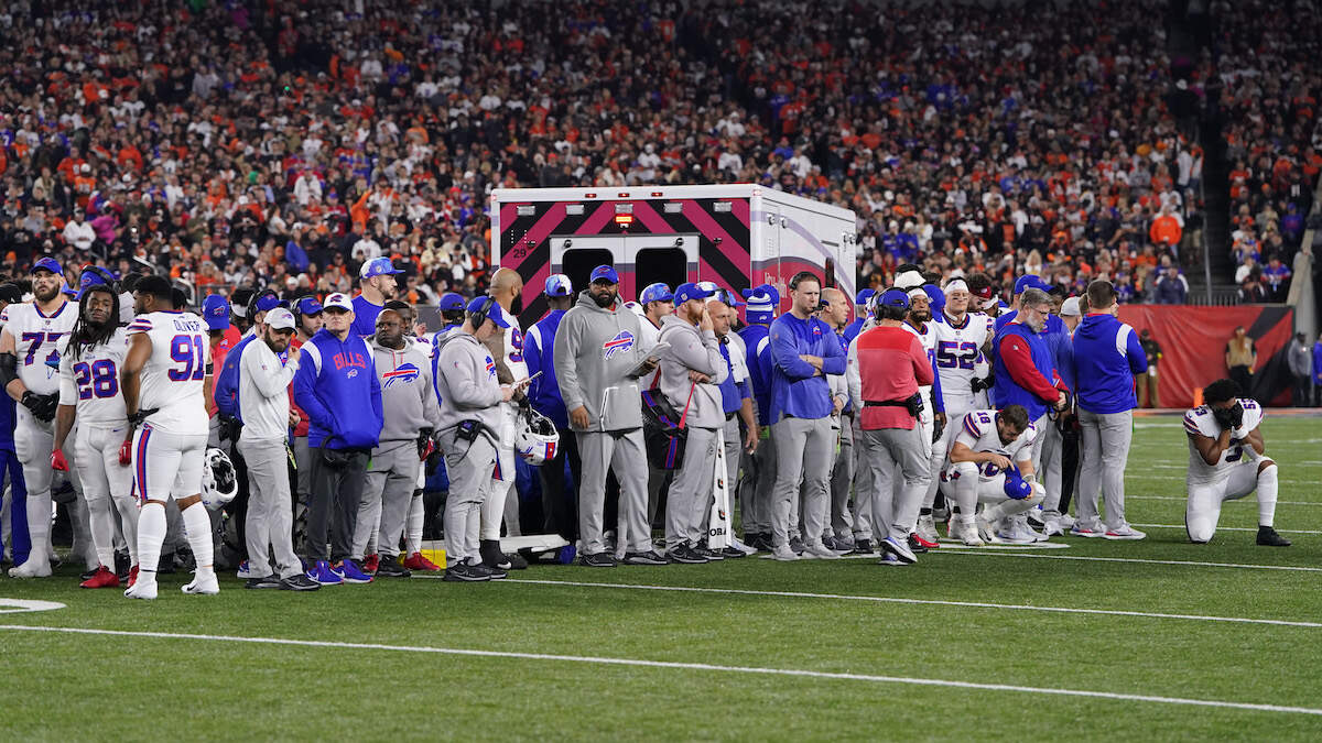 Hamlin tackled Bengals wide receiver Tee Higgins during the first quarter of Monday's game and got back to his feet before suddenly falling to the ground. A stretcher and ambulance came onto the field and CPR was administered by first responders.